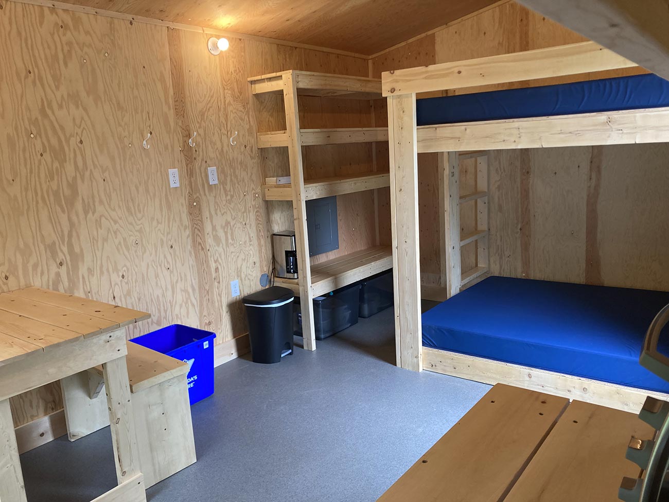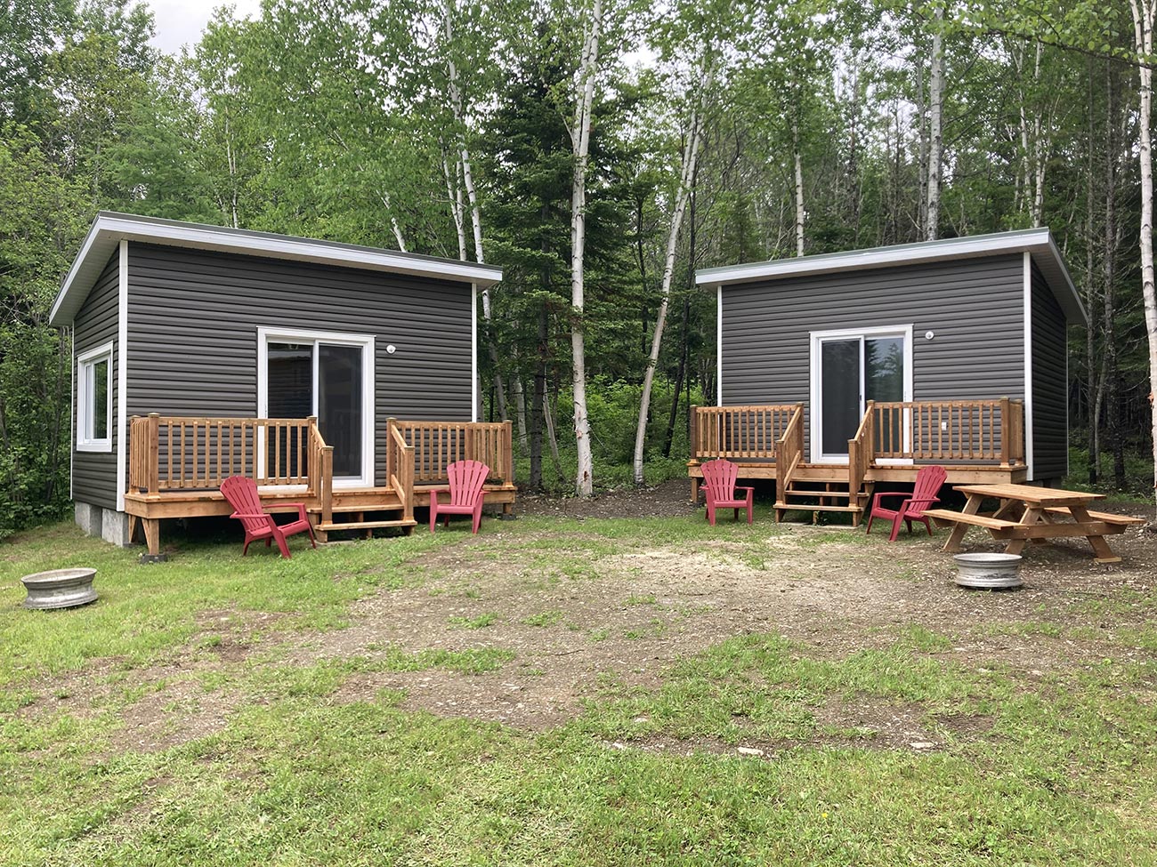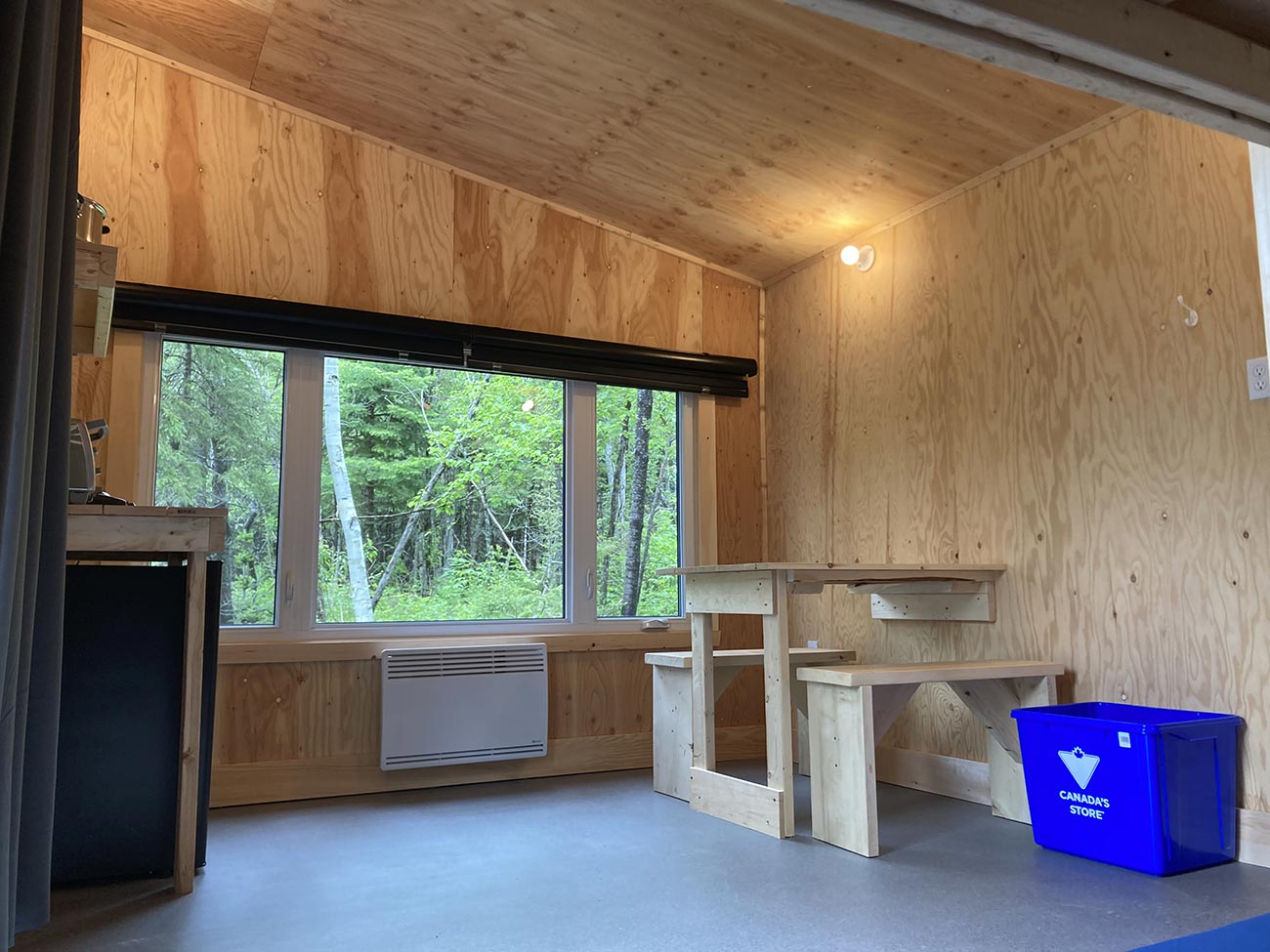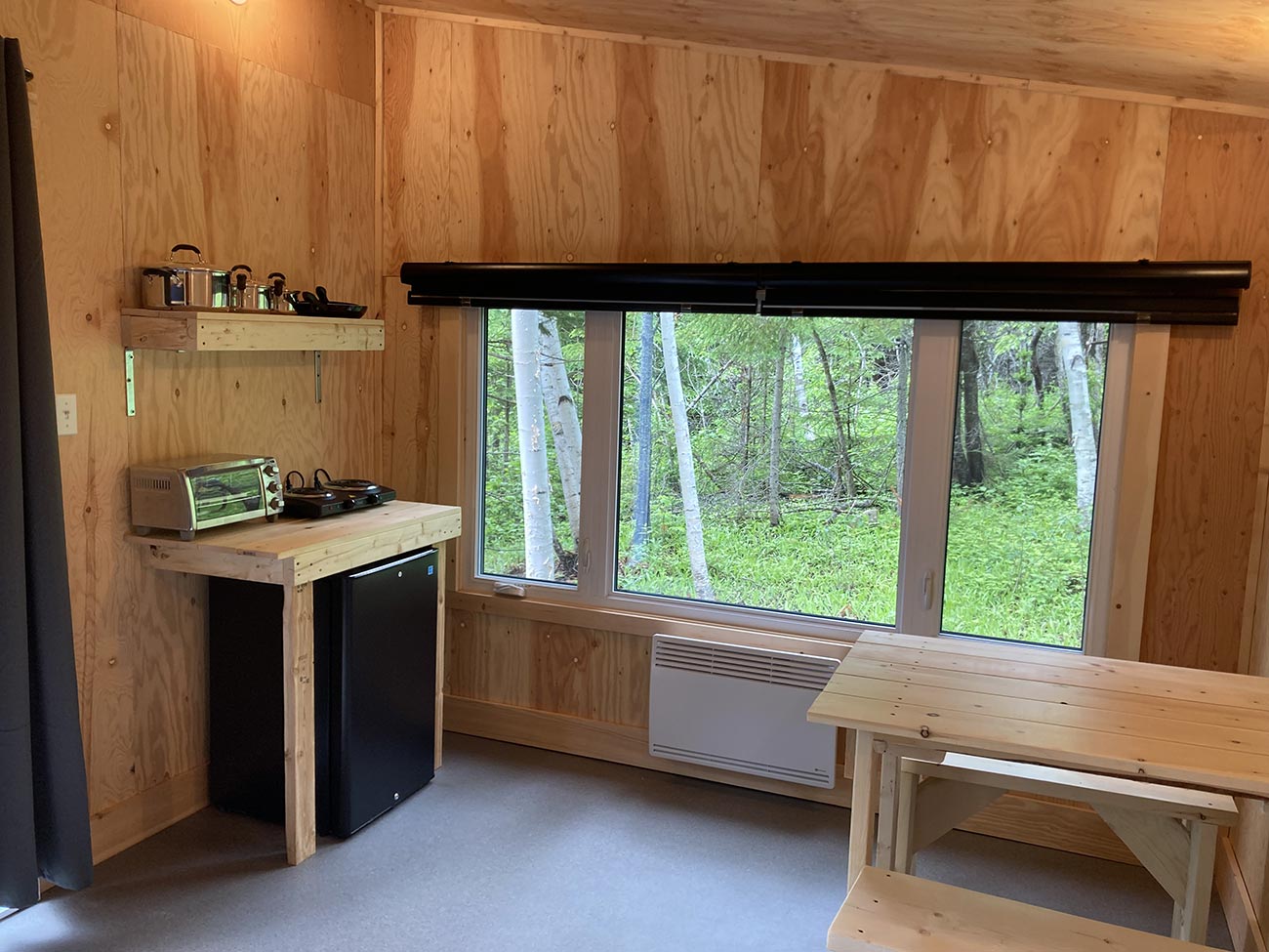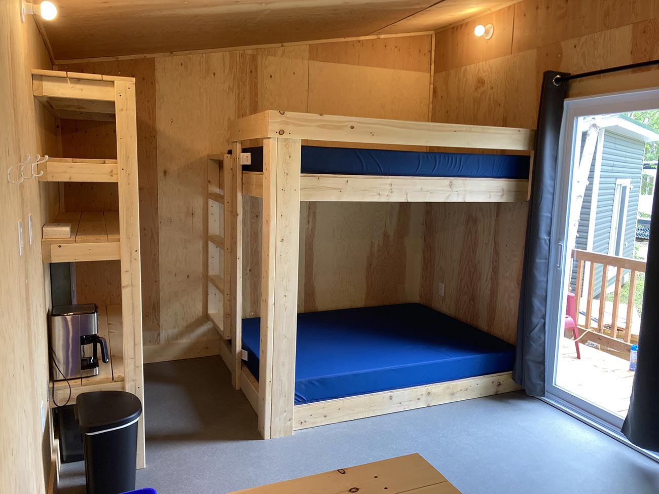 On y trouve 2 lits doubles superposés, du chauffage et de l’éclairage, un réchaud électrique à l’extérieur, un petit réfrigérateur, tout le nécessaire pour cuisiner et une galerie. Un prêt-à-camper peut accueillir 4 personnes.